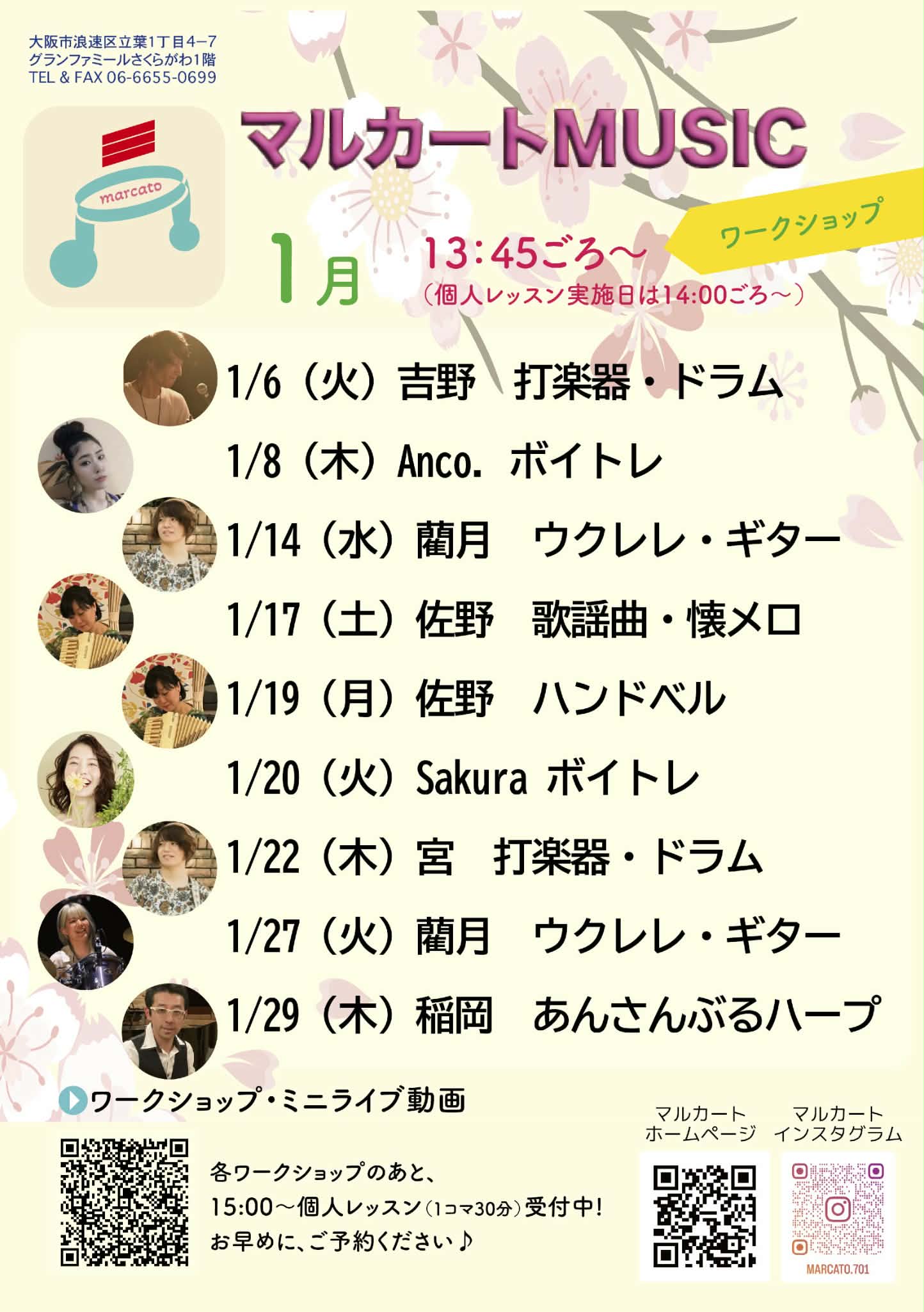 各ワークショップ開催日は15:00~個人レッスンも受け付けています。